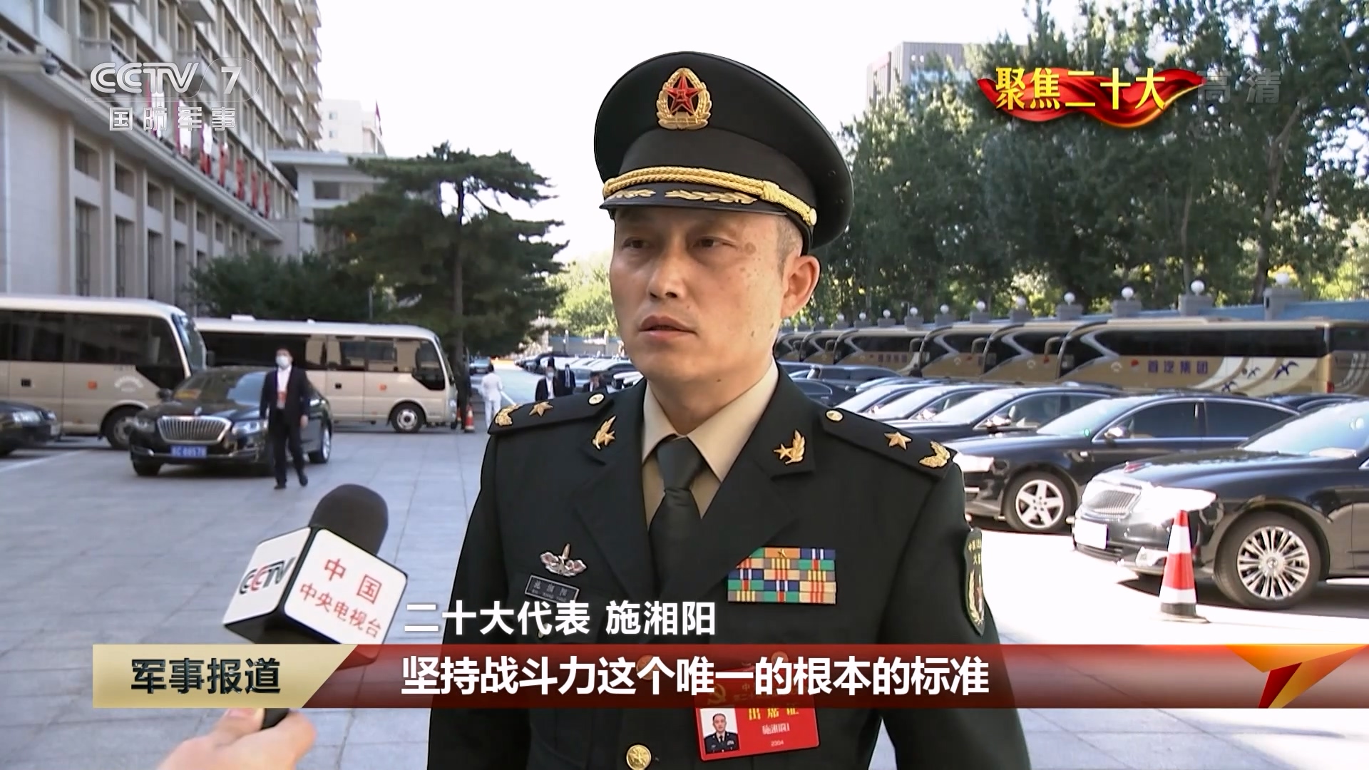 二十大代表 施湘陽:貫徹落實黨的二十大精神,就是要緊盯科技之變、戰爭之變、對手之變,堅持戰斗力這個唯一的根本的標準,強化需求牽引、創新驅動、科技賦能,強化實戰試驗、實戰訓練、實戰檢驗,加快戰斗力供給側轉型升級,為打造現代化新域新質的武器裝備,鍛造可信可靠的王牌底牌部隊,發揮好磨刀石作用。