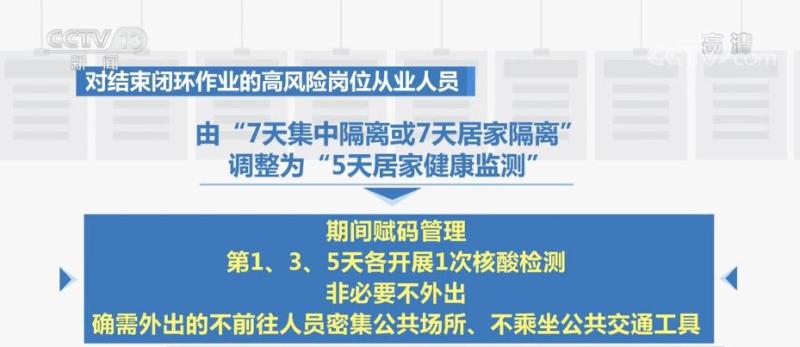 對(duì)結(jié)束閉環(huán)作業(yè)的高風(fēng)險(xiǎn)崗位從業(yè)人員由“7天集中隔離或7天居家隔離”調(diào)整為“5天居家健康監(jiān)測(cè)”,期間賦碼管理,第1、3、5天各開展1次核酸檢測(cè),非必要不外出,確需外出的不前往人員密集公共場(chǎng)所、不乘坐公共交通工具。