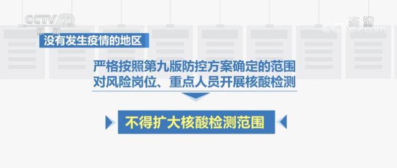 沒有發(fā)生疫情的地區(qū)嚴(yán)格按照第九版防控方案確定的范圍對(duì)風(fēng)險(xiǎn)崗位、重點(diǎn)人員開展核酸檢測(cè),不得擴(kuò)大核酸檢測(cè)范圍。一般不按行政區(qū)域開展全員核酸檢測(cè),只在感染來源和傳播鏈條不清、社區(qū)傳播時(shí)間較長(zhǎng)等疫情底數(shù)不清時(shí)開展。制定規(guī)范核酸檢測(cè)的具體實(shí)施辦法,重申和細(xì)化有關(guān)要求,糾正“一天兩檢”“一天三檢”等不科學(xué)做法。