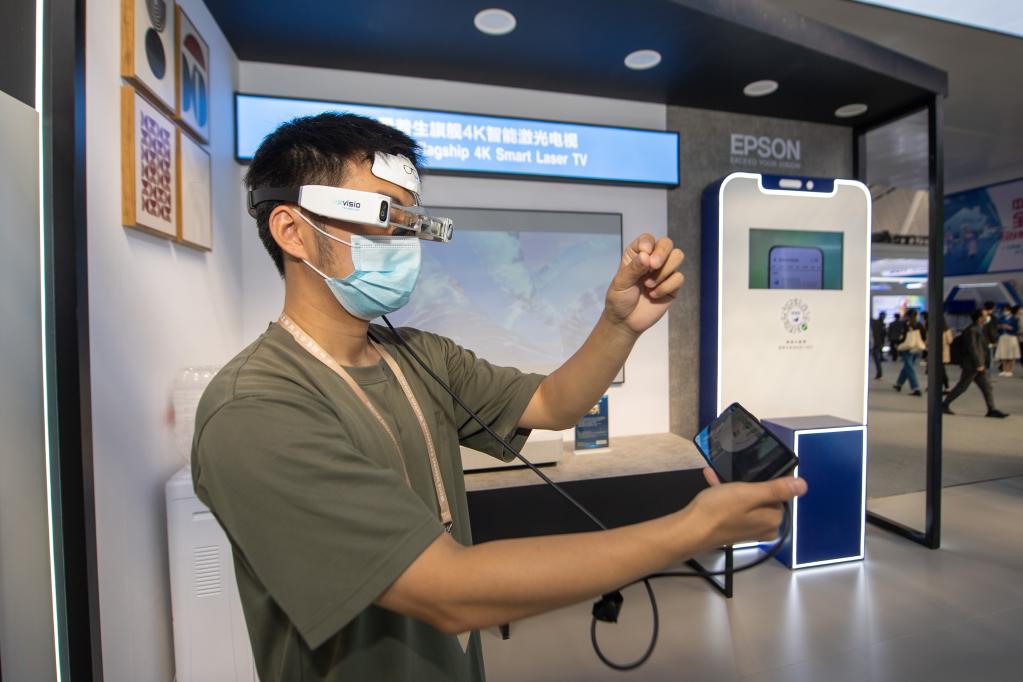 11月10日,觀眾在愛普生公司展臺體驗AR感知交互眼鏡系統。新華社記者 江漢 攝