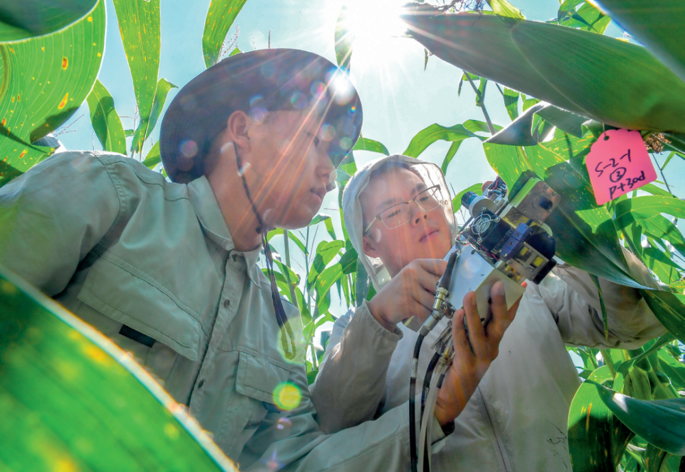 在吉林省梨樹縣,中國(guó)農(nóng)業(yè)大學(xué)在讀博士生沙野(右)和崔帥在試驗(yàn)田里測(cè)量玉米光合作用(2022年8月17日攝)。 張楠攝