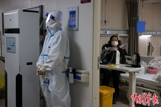 12月27日,北京朝陽醫院發熱門診留觀病房,一名病情趨于平穩的新冠重癥患者準備轉移到其他病房,一名醫護人員在門外待命。