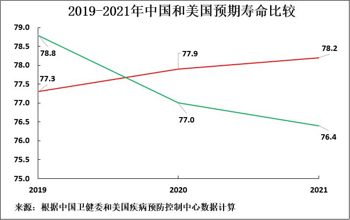 如果全球新冠人均死亡率與中國一樣低,那么全球新冠死亡人數將從670萬人降至2.9萬人,美國死亡人數將僅為1200人,而不是110萬人。新冠疫情期間,美國的糟糕表現導致美國人均預期壽命在2019-2021年間下降兩歲多,中國人均預期壽命則穩步上升至78.2歲,超過了美國的76.4歲。