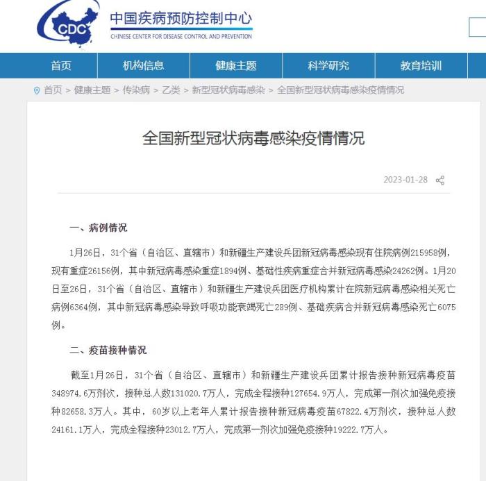 1月26日,31個省(自治區、直轄市)和新疆生產建設兵團新冠病毒感染現有住院病例215958例,現有重癥26156例,其中新冠病毒感染重癥1894例、基礎性疾病重癥合并新冠病毒感染24262例。1月20日至26日,31個省(自治區、直轄市)和新疆生產建設兵團醫療機構累計在院新冠病毒感染相關死亡病例6364例,其中新冠病毒感染導致呼吸功能衰竭死亡289例、基礎疾病合并新冠病毒感染死亡6075例。