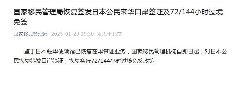國家移民管理局恢復簽發(fā)日本公民來華口岸簽證及72/144小時過境免簽
