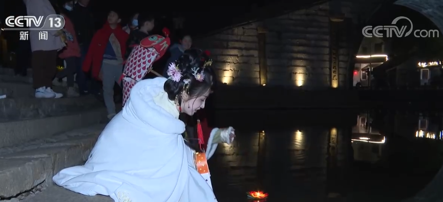 夜幕降臨,身著傳統服飾的人們手提燈籠,行走在青石板街上,將一盞盞承載著心愿的花燈放入河中。在掛滿燈謎牌子的街市,游客和居民參與猜燈謎活動,感受傳統文化與古建筑的魅力。