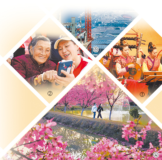 圖④:日前,人們?cè)诤鲜〕幨辛_橋鎮(zhèn)櫻花園賞花游玩。