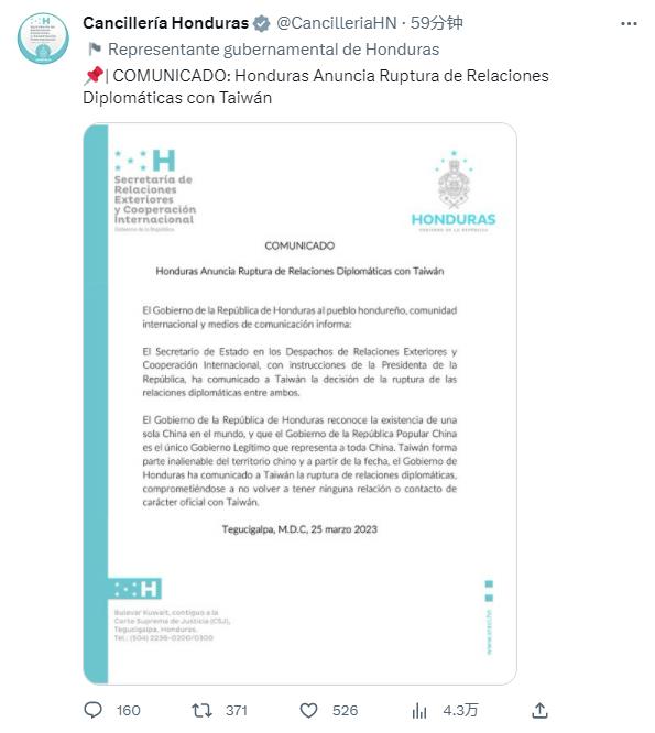 當地時間3月25日,洪都拉斯外交部發表聲明,正式宣布與中國臺灣斷絕“外交關系”。