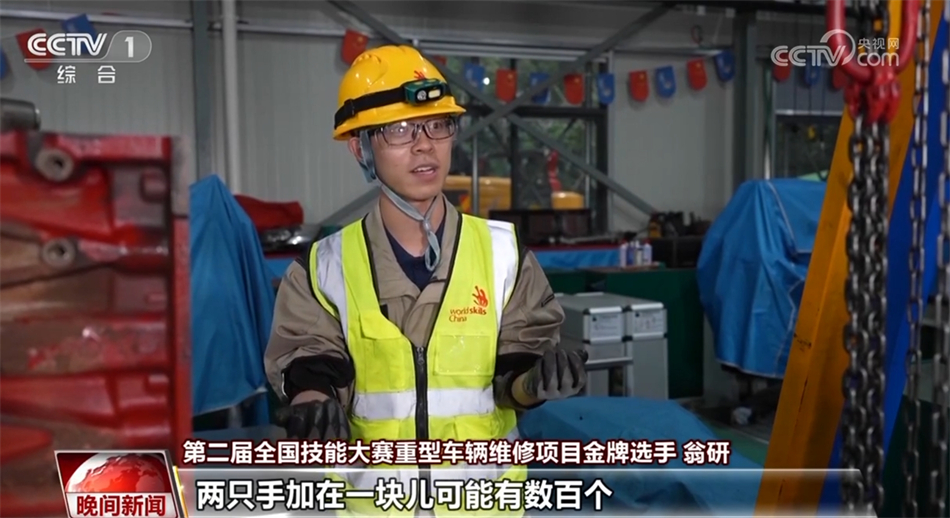 第二屆全國技能大賽重型車輛維修項目金牌選手 翁研:我們這個訓練講究的就是熟練度,每天都在練。我記得有一次練得很累,在車上睡著了,一覺醒來,手上面都是蚊子包,兩只手加在一塊兒可能有數百個。