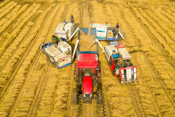 2024年10月13日,在黑龍江省綏化市北林區雙河鎮稻香村,村民駕駛農機進行卸糧作業(無人機照片)。新華社記者 張濤 攝