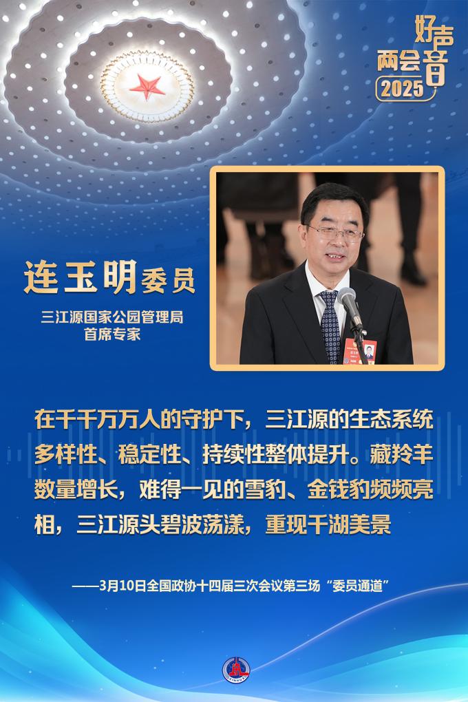 第一位回答記者提問的三江源國家公園管理局首席專家連玉明委員,是一名援青干部。他告訴大家,在三江源國家公園,有21432名生態(tài)管護員。在千千萬萬人的守護下,三江源的生態(tài)系統(tǒng)多樣性、穩(wěn)定性、持續(xù)性整體提升。藏羚羊數量增長,難得一見的雪豹、金錢豹頻頻亮相,三江源頭碧波蕩漾,重現(xiàn)千湖美景。