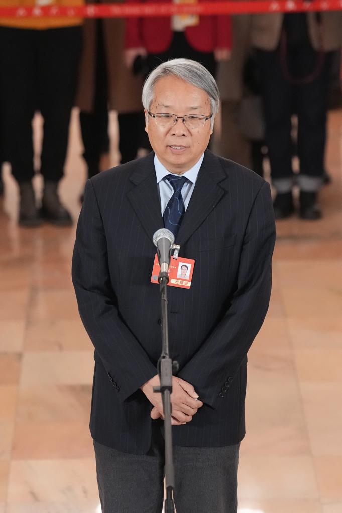3月10日,全國政協(xié)十四屆三次會議第三場“委員通道”集體采訪活動在北京人民大會堂舉行。這是全國政協(xié)委員何潤生接受媒體采訪。新華社記者 金良快 攝