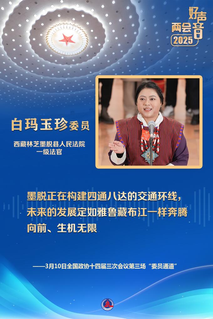 白瑪玉珍委員來自全國最后一個通公路的縣——西藏墨脫。她說,墨脫實現(xiàn)了從“高原孤島”向“美麗邊城”的時代蛻變,家家戶戶用上了干凈水、穩(wěn)定電、高速網,老百姓吃上了“生態(tài)旅游飯”,增收的路子越來越寬。