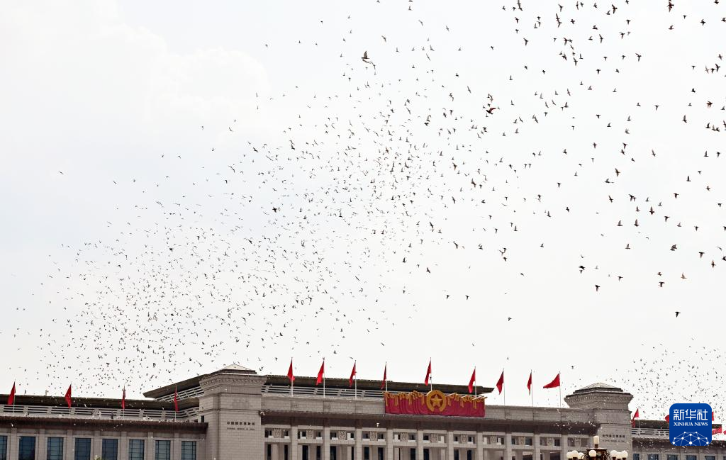 9月3日,紀念中國人民抗日戰爭暨世界反法西斯戰爭勝利80周年大會在北京隆重舉行。這是紀念大會現場放飛鴿子。