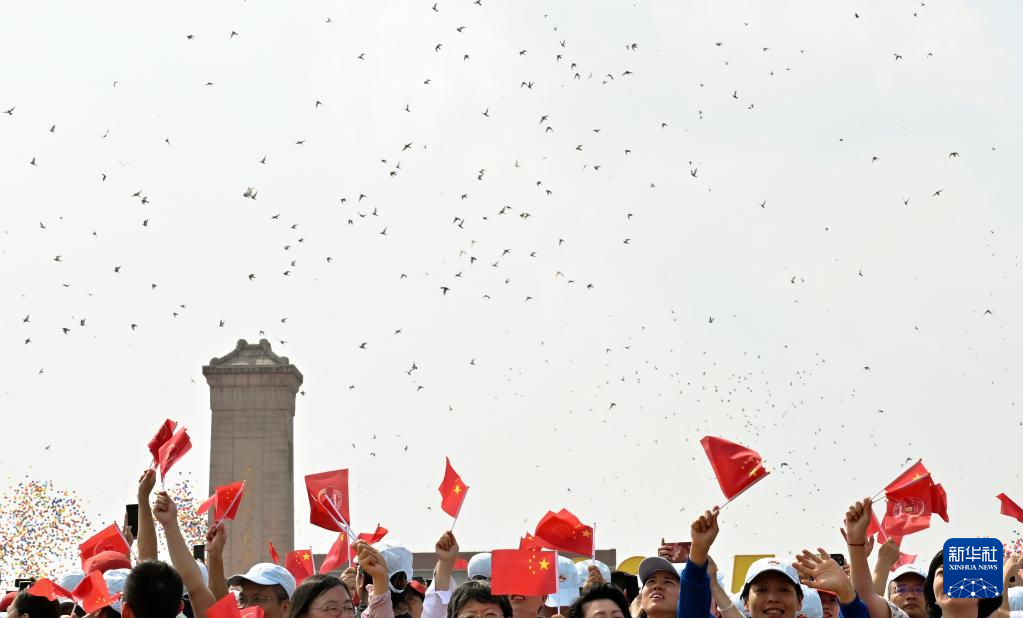 9月3日,紀念中國人民抗日戰爭暨世界反法西斯戰爭勝利80周年大會在北京隆重舉行。這是紀念大會現場放飛鴿子和氣球。