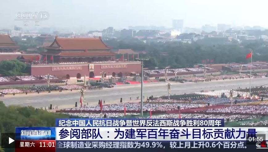 紀念中國人民抗日戰爭暨世界反法西斯戰爭勝利80周年大會9月3日隆重舉行。受閱部隊作為共和國武裝力量的代表,光榮接受了黨和人民的檢閱。中央軍委主席習近平簽署通令,嘉獎參閱全體人員。廣大參閱官兵備受鼓舞,一致表示,一定不負習主席重托,為如期實現建軍一百年奮斗目標、加快把人民軍隊建成世界一流軍隊不懈奮斗。