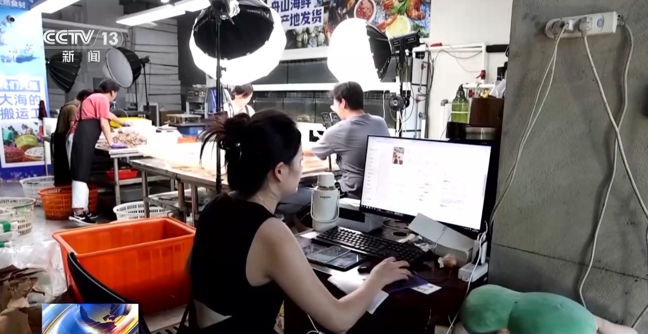 漁船忙著卸貨的同時,在距離碼頭不遠的電商產業園里,主播們正售賣新鮮上市的梭子蟹。為了縮短發貨時間,這家店鋪在直播的同時打包海鮮,即買即發,每天可以發出六到七百個訂單。