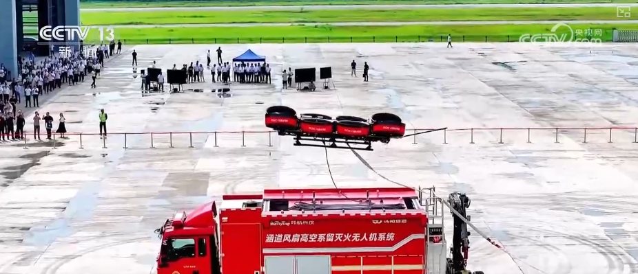 無人機(jī)企業(yè)技術(shù)保障經(jīng)理唐海豐介紹,這是全球首款采用涵道電動(dòng)風(fēng)扇推進(jìn)技術(shù)設(shè)計(jì)的高空消防滅火無人機(jī),具有更大的推力,載荷達(dá)到400公斤,爬升至百米高空僅需不到1分鐘,很好解決了城市高空消防難題。
