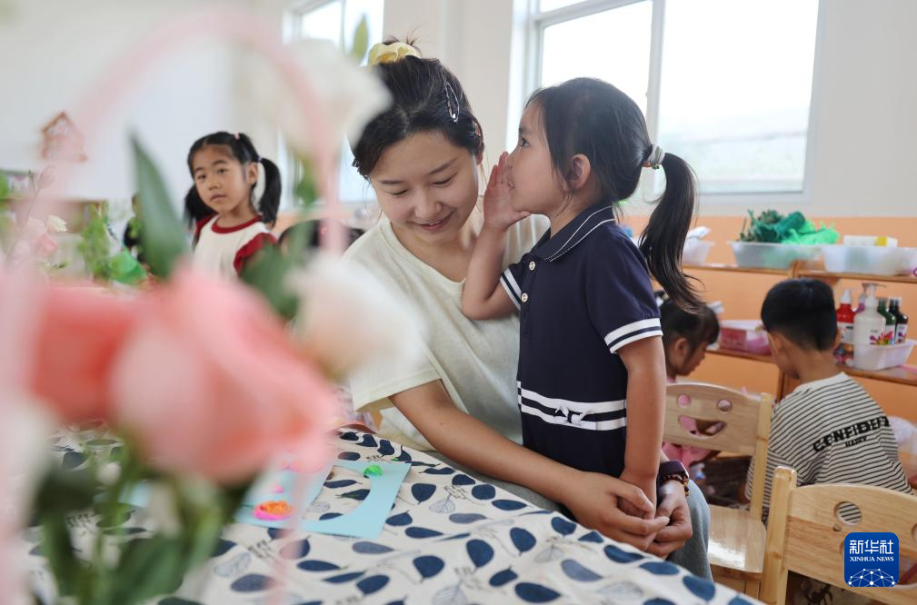 9月9日,在山東省臨沂市沂南縣銅井鎮(zhèn)中心幼兒園,小朋友在跟老師分享節(jié)日祝福悄悄話。