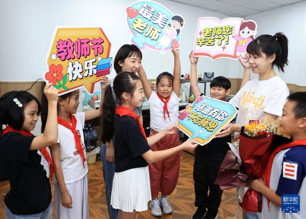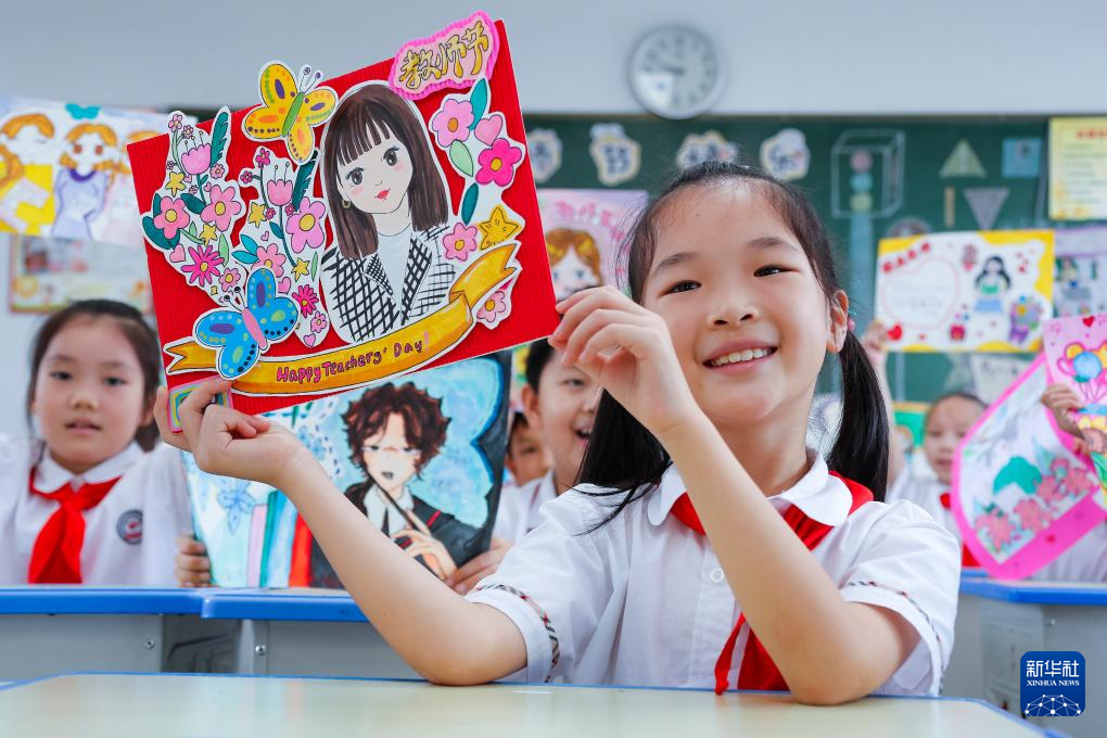 9月9日,在武漢市未來實(shí)驗(yàn)小學(xué)美林校區(qū),學(xué)生為教師送上節(jié)日祝福。