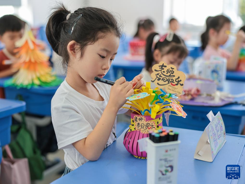 9月9日,在山東省榮成市府新小學(xué)教室內(nèi),孩子們在制作送給老師的手工作品。