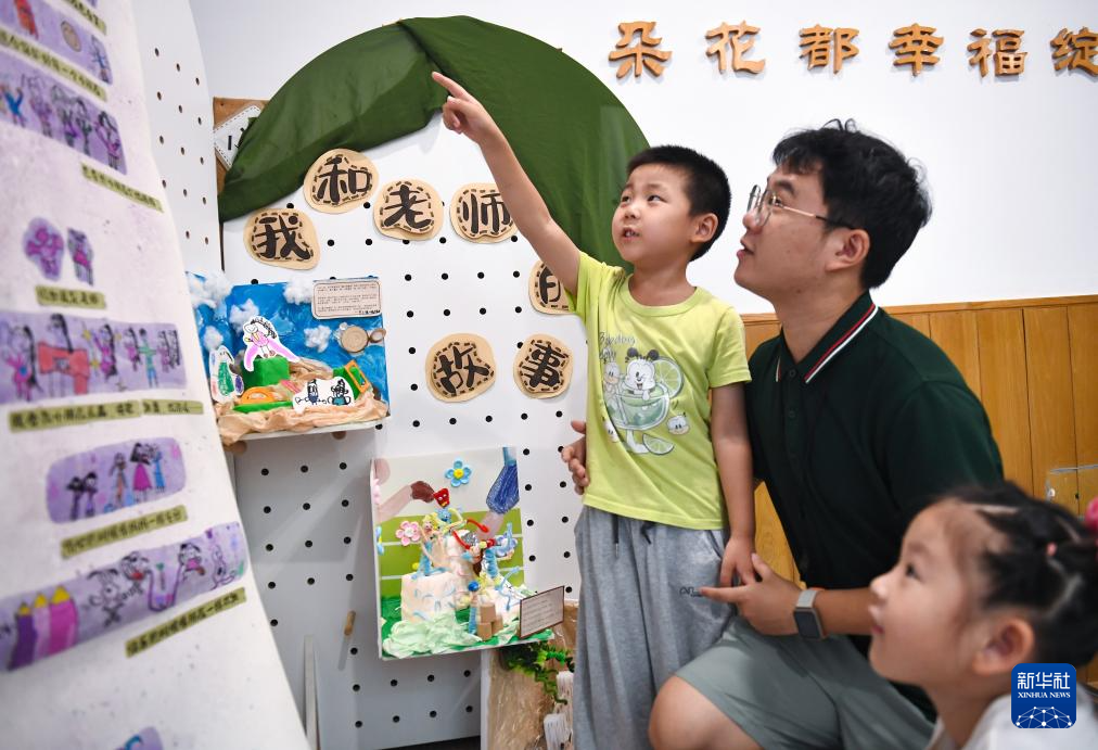 9月9日,在南京新世紀(jì)實(shí)驗(yàn)幼兒園,小朋友給老師講述自己創(chuàng)作的“我和老師的故事”。