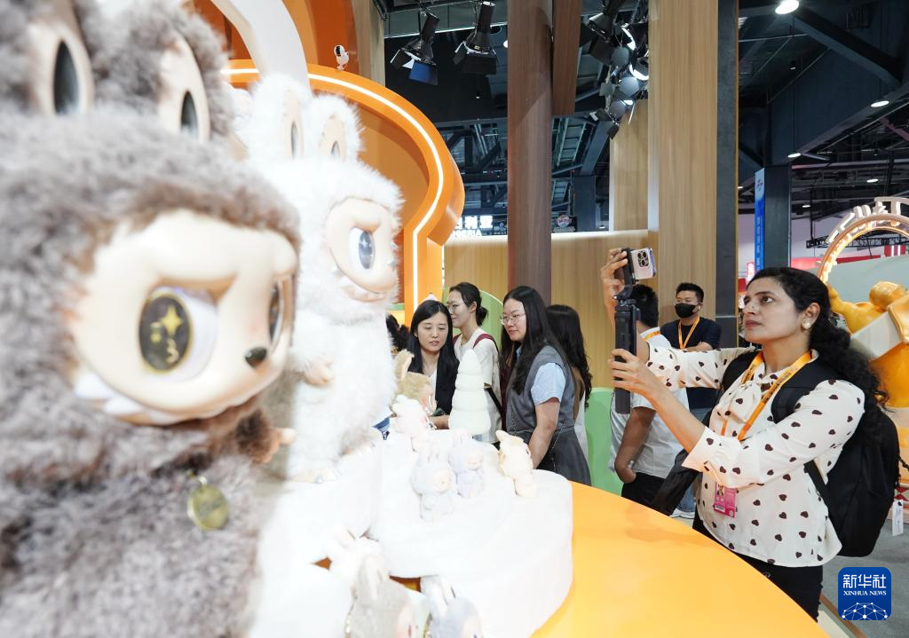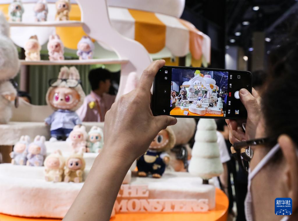 9月10日,參觀者在泡泡瑪特展區拍攝展品。