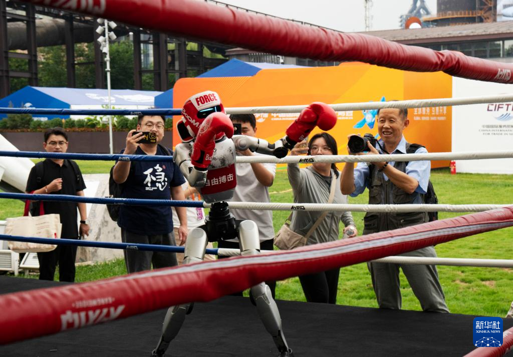 9月10日,在體育服務專題展上,觀眾在拍攝自由搏擊機器人。