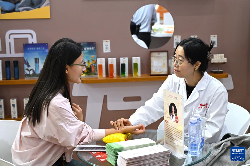 9月10日,參展者(左)在服貿會健康衛生服務展區體驗中醫問診。