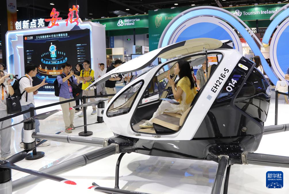9月10日,在2025年服貿會主題展展區,一名媒體人員(右)在主賓省安徽省展臺體驗了解無人駕駛載人電動垂直起降航空器。