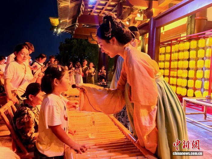 9月5日,長沙杜甫江閣“喜相逢”唐風(fēng)互動夜游活動中,演員正在與觀眾互動。 張雪盈 攝