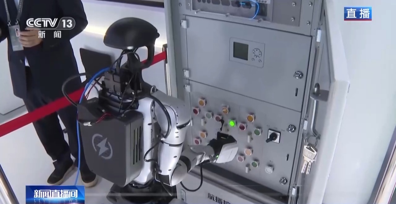 例如這臺由當地電力部門經過精準改造后的同款格斗人形機器人,正在代替人工嘗試進行電力檢修,它能夠通過AR調度平臺遠程控制,去旋扭、翻蓋和按壓。當賽場上的人形機器人穿上“工裝”,可以在生產和實踐中大展拳腳。