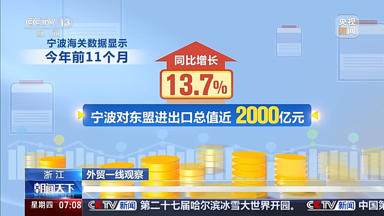 寧波海關數據顯示,今年前11個月,寧波對東盟進出口總值近2000億元,同比增長13.7%。其中,機電產品作為寧波對東盟出口商品中的主力軍,前11個月出口了近600億元,增長22.9%。