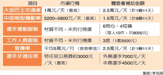 報道稱,郭素春指出,臺當局“體委會”補助路跑協會一部大型巴士交通車費用,竟然編列一天租用費為2.5萬(新臺幣,下同)元;但熟悉行情的人都知道,現在要租用頂級配備的大型雙層游覽車,一天頂多1萬元。“體委會”補助路跑活動8部廂型車做為機動車,補助標準是一輛車一天1.5萬元,市場行情最高的也不過是5000多元,也遠高于頂級九人座廂型車市場行情一天6000元的行情價甚多。宣傳車部分,依市場行情,一輛車(含油)一個月平均5萬元;而“體委會”編列的補助金額一天就要2.5萬元。