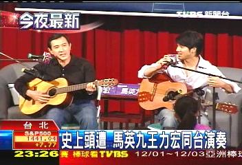 據(jù)報道,馬英九昨晚出席座談會時穿著牛仔褲和Polo衫,與王力宏合唱英文歌曲“I Understand”。馬英九說,這是他高三時花了170多元買的吉他練的第一首歌曲;王力宏則從未聽過此曲,先前還熱心找了一些“老歌”,沒想到在馬英九眼里全是“新歌”。