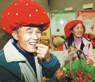 草莓拿下臺灣“十大經(jīng)典水果”票選活動第一名,苗栗縣果農(nóng)昨天在頒獎典禮上戴著可愛的草莓帽,愉快地品嘗美味的草莓。(聯(lián)合報圖)