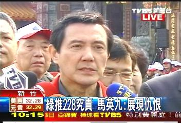 馬英九今天上午對此表示,“它展現的是一種仇恨,和臺灣人的基本價值‘包容’有相當大的距離,尤其最近‘立院’藍綠正在推動限定繼承,也就是說未成年人不必去背負他親人的債務,可是沒想到民進黨會推出這樣的‘法案’,在選舉前夕顯然他們是想制造沖突、對立,獲取選舉利益,以這種方式消費‘二二八’,我覺得相當不好。”