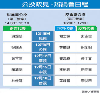 該活動8日下午將先在民視登場,民進黨前主席游錫堃是“討黨產公投”正方代表,無反方;“反貪腐公投”辯論,國民黨“立委”賴士葆和臺當局“新聞局長”謝志偉將代表正、反方。