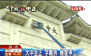 中國臺灣網12月7日消息 “臺灣民主紀念館”(原名中正紀念堂)拆除“大中至正”牌匾今天上午動工,拆除工作2小時并不順利,僅拆除園區內牌匾“正”字一顆螺絲;施工人員中午采買工具后,午后繼續拆除,截止發稿時止,相關工作人員已用吊車將“中”字拉了下來。