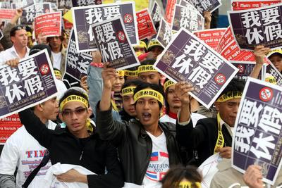 臺灣移工聯(lián)盟9日在臺北市舉行“我要休假——臺灣移工大游行”,來自全臺各地的外勞一起爭取休假權(quán)!爸醒肷纭庇浾哙嵔芪臄z