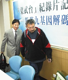 “打馬”光盤制作人許逢麟(右)昨天召開記者會,被質疑所取得的新聞畫面版權來源時,僅表示如電視臺認為有問題請舉證,隨即匆匆離去。《聯合報》記者潘俊宏攝