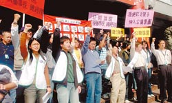 傳聞臺(tái)灣廣電基金執(zhí)行長林育卉是華視新總經(jīng)理人選之一,華視工會(huì)12日在公司外廣場(chǎng)抗議,表達(dá)拒絕政治黑手伸入公廣集團(tuán)高層人事的立場(chǎng)。臺(tái)灣《中國時(shí)報(bào)》粘耿豪攝