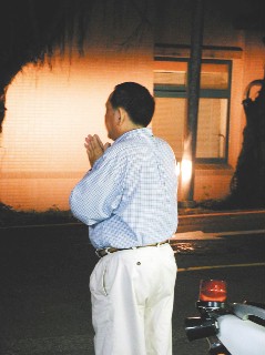 基隆巿小學四年級女童曹博涵疑上吊,其祖父在醫院急診室外對天祈求神明保佑。可惜醫院回天乏術。(臺灣《聯合報》圖片)