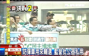 陳水扁的防彈公務車大咧咧地貼著民進黨的競選標語 (臺灣TVBS電視臺畫面截圖)