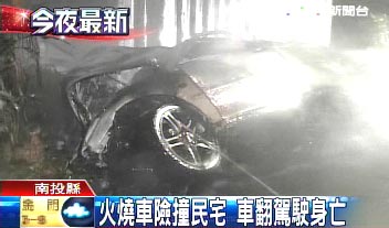 報道稱,晚間6時許,這臺小轎車行經中潭公路32公里處突然失控,先翻覆掉落水溝,再滑行沖撞一戶民宅,接著便起火燃燒。目擊者稱:“我就沒看到什么,我就趕快拿水來灌救,只聽到砰一聲,火就很大了!”