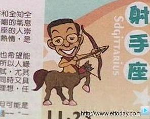 除了封面有意涵,這本農民歷里的插圖更有趣。星座運勢里的射手座又被稱為人馬座,畫面中的人是謝長廷、底下踩著的是馬,是否有影射什么,讓人有很大的想像空間。