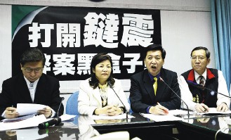 國(guó)民黨“立法院”黨團(tuán)書記長(zhǎng)郭素春(左二)、“立委”費(fèi)鴻泰(右二)等上午舉行記者會(huì),質(zhì)疑臺(tái)當(dāng)局“國(guó)防部”投資鐽震公司過程疑點(diǎn)重重。 (臺(tái)灣《聯(lián)合晚報(bào)》圖片)