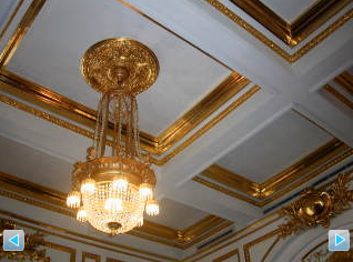 臺(tái)北賓館全館一樓中央廣間的“鍍金工程”,將純白的屋頂及墻面都貼上金箔框飾,與百年的水晶燈相互輝映。(臺(tái)灣東森新聞圖片)
