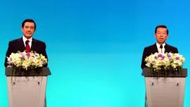 臺灣地區領導人選舉首場候選人電視政見發表會,29日在臺北公共電視臺舉行。圖左為國民黨候選人馬英九,右為民進黨候選人謝長廷。來源:臺灣“中央社”