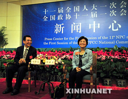 3月7日,全國(guó)人大代表林毅夫(左)、陳云英在十一屆全國(guó)人大一次會(huì)議、全國(guó)政協(xié)十一屆一次會(huì)議新聞中心共同接受記者采訪。 新華社記者 劉泉龍 攝